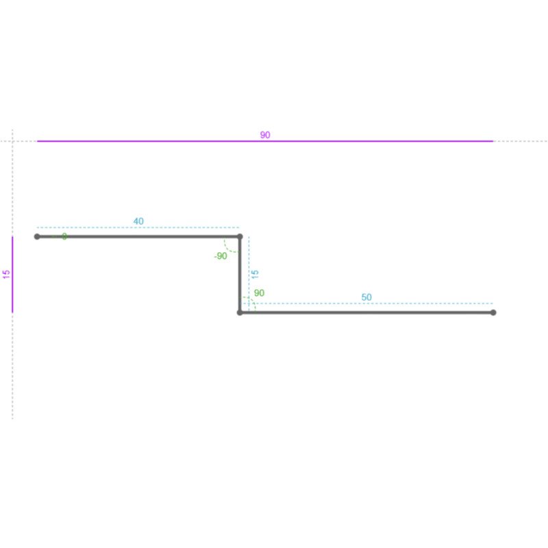 Segment 1 Largeur : 40 mm Découpe 1( D 1 ) : Longueur : 50 mm Largeur : 20 mm Position X (en haut à gauche) : 0 mm Position Y (en haut à gauche) : 1000 mm Position X Absolue (en haut à gauche) : 0 mm Position Y Absolue (en haut à gauche) : 1000 mm Découpe 2( D 2 ) : Longueur : 50 mm Largeur : 10 mm Position X (en haut à gauche) : 0 mm Position Y (en haut à gauche) : 0 mm Position X Absolue (en haut à gauche) : 0 mm Position Y Absolue (en haut à gauche) : 0 mm Segment 2 Largeur : 15 mm Angle : -90 ° Segment 3 Largeur : 50 mm Angle : 90 ° Poinçonnage 1( U 1 ) : Type : Rond - 4.10 Longueur : 4.1 mm Largeur : 4.1 mm Position X (au centre) : 25 mm Position Y (au centre) : 50 mm Rotation : 0 ° Position X Absolue avec perte au pli (au centre) : 73 mm Position Y Absolue avec perte au pli (au centre) : 50 mm Poinçonnage 2( U 2 ) : Type : Rond - 4.10 Longueur : 4.1 mm Largeur : 4.1 mm Position X (au centre) : 25 mm Position Y (au centre) : 100 mm Rotation : 0 ° Position X Absolue avec perte au pli (au centre) : 73 mm Position Y Absolue avec perte au pli (au centre) : 100 mm Poinçonnage 3( U 3 ) : Type : Rond - 4.10 Longueur : 4.1 mm Largeur : 4.1 mm Position X (au centre) : 25 mm Position Y (au centre) : 150 mm Rotation : 0 ° Position X Absolue avec perte au pli (au centre) : 73 mm Position Y Absolue avec perte au pli (au centre) : 150 mm Poinçonnage 4( U 4 ) : Type : Rond - 4.10 Longueur : 4.1 mm Largeur : 4.1 mm Position X (au centre) : 25 mm Position Y (au centre) : 200 mm Rotation : 0 ° Position X Absolue avec perte au pli (au centre) : 73 mm Position Y Absolue avec perte au pli (au centre) : 200 mm Poinçonnage 5( U 5 ) : Type : Rond - 4.10 Longueur : 4.1 mm Largeur : 4.1 mm Position X (au centre) : 25 mm Position Y (au centre) : 250 mm Rotation : 0 ° Position X Absolue avec perte au pli (au centre) : 73 mm Position Y Absolue avec perte au pli (au centre) : 250 mm Poinçonnage 6( U 6 ) : Type : Rond - 4.10 Longueur : 4.1 mm Largeur : 4.1 mm Position X (au centre) : 25 mm Position Y (au centre) : 300 mm Rotation : 0 ° Position X Absolue avec perte au pli (au centre) : 73 mm Position Y Absolue avec perte au pli (au centre) : 300 mm Poinçonnage 7( U 7 ) : Type : Rond - 4.10 Longueur : 4.1 mm Largeur : 4.1 mm Position X (au centre) : 25 mm Position Y (au centre) : 350 mm Rotation : 0 ° Position X Absolue avec perte au pli (au centre) : 73 mm Position Y Absolue avec perte au pli (au centre) : 350 mm Poinçonnage 8( U 8 ) : Type : Rond - 4.10 Longueur : 4.1 mm Largeur : 4.1 mm Position X (au centre) : 25 mm Position Y (au centre) : 400 mm Rotation : 0 ° Position X Absolue avec perte au pli (au centre) : 73 mm Position Y Absolue avec perte au pli (au centre) : 400 mm Poinçonnage 9( U 9 ) : Type : Rond - 4.10 Longueur : 4.1 mm Largeur : 4.1 mm Position X (au centre) : 25 mm Position Y (au centre) : 450 mm Rotation : 0 ° Position X Absolue avec perte au pli (au centre) : 73 mm Position Y Absolue avec perte au pli (au centre) : 450 mm Poinçonnage 10( U 10 ) : Type : Rond - 4.10 Longueur : 4.1 mm Largeur : 4.1 mm Position X (au centre) : 25 mm Position Y (au centre) : 500 mm Rotation : 0 ° Position X Absolue avec perte au pli (au centre) : 73 mm Position Y Absolue avec perte au pli (au centre) : 500 mm Poinçonnage 11( U 11 ) : Type : Rond - 4.10 Longueur : 4.1 mm Largeur : 4.1 mm Position X (au centre) : 25 mm Position Y (au centre) : 550 mm Rotation : 0 ° Position X Absolue avec perte au pli (au centre) : 73 mm Position Y Absolue avec perte au pli (au centre) : 550 mm Poinçonnage 12( U 12 ) : Type : Rond - 4.10 Longueur : 4.1 mm Largeur : 4.1 mm Position X (au centre) : 25 mm Position Y (au centre) : 600 mm Rotation : 0 ° Position X Absolue avec perte au pli (au centre) : 73 mm Position Y Absolue avec perte au pli (au centre) : 600 mm Poinçonnage 13( U 13 ) : Type : Rond - 4.10 Longueur : 4.1 mm Largeur : 4.1 mm Position X (au centre) : 25 mm Position Y (au centre) : 650 mm Rotation : 0 ° Position X Absolue avec perte au pli (au centre) : 73 mm Position Y Absolue avec perte au pli (au centre) : 650 mm Poinçonnage 14( U 14 ) : Type : Rond - 4.10 Longueur : 4.1 mm Largeur : 4.1 mm Position X (au centre) : 25 mm Position Y (au centre) : 700 mm Rotation : 0 ° Position X Absolue avec perte au pli (au centre) : 73 mm Position Y Absolue avec perte au pli (au centre) : 700 mm Poinçonnage 15( U 15 ) : Type : Rond - 4.10 Longueur : 4.1 mm Largeur : 4.1 mm Position X (au centre) : 25 mm Position Y (au centre) : 750 mm Rotation : 0 ° Position X Absolue avec perte au pli (au centre) : 73 mm Position Y Absolue avec perte au pli (au centre) : 750 mm Poinçonnage 16( U 16 ) : Type : Rond - 4.10 Longueur : 4.1 mm Largeur : 4.1 mm Position X (au centre) : 25 mm Position Y (au centre) : 800 mm Rotation : 0 ° Position X Absolue avec perte au pli (au centre) : 73 mm Position Y Absolue avec perte au pli (au centre) : 800 mm Poinçonnage 17( U 17 ) : Type : Rond - 4.10 Longueur : 4.1 mm Largeur : 4.1 mm Position X (au centre) : 25 mm Position Y (au centre) : 850 mm Rotation : 0 ° Position X Absolue avec perte au pli (au centre) : 73 mm Position Y Absolue avec perte au pli (au centre) : 850 mm Poinçonnage 18( U 18 ) : Type : Rond - 4.10 Longueur : 4.1 mm Largeur : 4.1 mm Position X (au centre) : 25 mm Position Y (au centre) : 900 mm Rotation : 0 ° Position X Absolue avec perte au pli (au centre) : 73 mm Position Y Absolue avec perte au pli (au centre) : 900 mm Poinçonnage 19( U 19 ) : Type : Rond - 4.10 Longueur : 4.1 mm Largeur : 4.1 mm Position X (au centre) : 25 mm Position Y (au centre) : 950 mm Rotation : 0 ° Position X Absolue avec perte au pli (au centre) : 73 mm Position Y Absolue avec perte au pli (au centre) : 950 mm Poinçonnage 20( U 20 ) : Type : Rond - 4.10 Longueur : 4.1 mm Largeur : 4.1 mm Position X (au centre) : 25 mm Position Y (au centre) : 1000 mm Rotation : 0 ° Position X Absolue avec perte au pli (au centre) : 73 mm Position Y Absolue avec perte au pli (au c