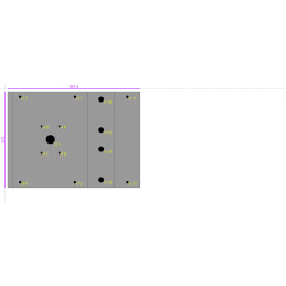 Segment 1 Largeur : 15 mm Segment 2 Largeur : 210 mm Angle : -90 ° Poinçonnage 1( U 1 ) : Type : Rond - 7.10 Longueur : 7.1 mm Largeur : 7.1 mm Position X (au centre) : 174 mm Position Y (au centre) : 15 mm Rotation : 0 ° Position X Absolue avec perte au pli (au centre) : 185.5 mm Position Y Absolue avec perte au pli (au centre) : 15 mm Poinçonnage 2( U 2 ) : Type : Rond - 7.10 Longueur : 7.1 mm Largeur : 7.1 mm Position X (au centre) : 174 mm Position Y (au centre) : 255 mm Rotation : 0 ° Position X Absolue avec perte au pli (au centre) : 185.5 mm Position Y Absolue avec perte au pli (au centre) : 255 mm Poinçonnage 3( U 3 ) : Type : Rond - 7.10 Longueur : 7.1 mm Largeur : 7.1 mm Position X (au centre) : 20 mm Position Y (au centre) : 15 mm Rotation : 0 ° Position X Absolue avec perte au pli (au centre) : 31.5 mm Position Y Absolue avec perte au pli (au centre) : 15 mm Poinçonnage 4( U 4 ) : Type : Rond - 7.10 Longueur : 7.1 mm Largeur : 7.1 mm Position X (au centre) : 20 mm Position Y (au centre) : 255 mm Rotation : 0 ° Position X Absolue avec perte au pli (au centre) : 31.5 mm Position Y Absolue avec perte au pli (au centre) : 255 mm Poinçonnage 5( U 5 ) : Type : Rond - 25.00 Longueur : 25 mm Largeur : 25 mm Position X (au centre) : 105 mm Position Y (au centre) : 134.5 mm Rotation : 0 ° Position X Absolue avec perte au pli (au centre) : 116.5 mm Position Y Absolue avec perte au pli (au centre) : 134.5 mm Poinçonnage 6( U 6 ) : Type : Rond - 5.50 Longueur : 5.5 mm Largeur : 5.5 mm Position X (au centre) : 80 mm Position Y (au centre) : 97.5 mm Rotation : 0 ° Position X Absolue avec perte au pli (au centre) : 91.5 mm Position Y Absolue avec perte au pli (au centre) : 97.5 mm Poinçonnage 7( U 7 ) : Type : Rond - 5.50 Longueur : 5.5 mm Largeur : 5.5 mm Position X (au centre) : 80 mm Position Y (au centre) : 172.5 mm Rotation : 0 ° Position X Absolue avec perte au pli (au centre) : 91.5 mm Position Y Absolue avec perte au pli (au centre) : 172.5 mm Poinçonnage 8( U 8 ) : Type : Rond - 5.50 Longueur : 5.5 mm Largeur : 5.5 mm Position X (au centre) : 130 mm Position Y (au centre) : 97.5 mm Rotation : 0 ° Position X Absolue avec perte au pli (au centre) : 141.5 mm Position Y Absolue avec perte au pli (au centre) : 97.5 mm Poinçonnage 9( U 9 ) : Type : Rond - 5.50 Longueur : 5.5 mm Largeur : 5.5 mm Position X (au centre) : 130 mm Position Y (au centre) : 172.5 mm Rotation : 0 ° Position X Absolue avec perte au pli (au centre) : 141.5 mm Position Y Absolue avec perte au pli (au centre) : 172.5 mm Segment 3 Largeur : 75 mm Angle : -90 ° Poinçonnage 1( U 10 ) : Type : Rond - 15.00 Longueur : 15 mm Largeur : 15 mm Position X (au centre) : 37.5 mm Position Y (au centre) : 22 mm Rotation : 0 ° Position X Absolue avec perte au pli (au centre) : 255.5 mm Position Y Absolue avec perte au pli (au centre) : 22 mm Poinçonnage 2( U 11 ) : Type : Rond - 15.00 Longueur : 15 mm Largeur : 15 mm Position X (au centre) : 37.5 mm Position Y (au centre) : 108 mm Rotation : 0 ° Position X Absolue avec perte au pli (au centre) : 255.5 mm Position Y Absolue avec perte au pli (au centre) : 108 mm Poinçonnage 3( U 12 ) : Type : Rond - 15.00 Longueur : 15 mm Largeur : 15 mm Position X (au centre) : 37.5 mm Position Y (au centre) : 162 mm Rotation : 0 ° Position X Absolue avec perte au pli (au centre) : 255.5 mm Position Y Absolue avec perte au pli (au centre) : 162 mm Poinçonnage 4( U 13 ) : Type : Rond - 15.00 Longueur : 15 mm Largeur : 15 mm Position X (au centre) : 37.5 mm Position Y (au centre) : 248 mm Rotation : 0 ° Position X Absolue avec perte au pli (au centre) : 255.5 mm Position Y Absolue avec perte au pli (au centre) : 248 mm Segment 4 Largeur : 72 mm Angle : -90 ° Poinçonnage 1( U 14 ) : Type : Rond - 7.10 Longueur : 7.1 mm Largeur : 7.1 mm Position X (au centre) : 36 mm Position Y (au centre) : 15 mm Rotation : 0 ° Position X Absolue avec perte au pli (au centre) : 325.5 mm Position Y Absolue avec perte au pli (au centre) : 15 mm Poinçonnage 2( U 15 ) : Type : Rond - 7.10 Longueur : 7.1 mm Largeur : 7.1 mm Position X (au centre) : 36 mm Position Y (au centre) : 255 mm Rotation : 0 ° Position X Absolue avec perte au pli (au centre) : 325.5 mm Position Y Absolue avec perte au pli (au centre) : 255 mm